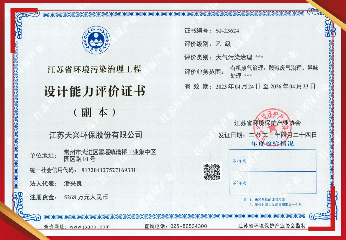 江蘇省環(huán)境污染治理工程設(shè)計能力評價證書